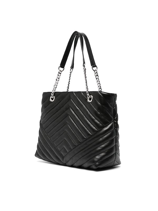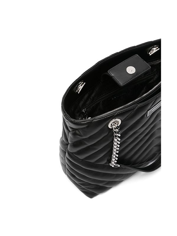 faux leather grained texture matelassé effect concealed magnetic fastening two leather and chain-link top handles logo plaque logo-jacquard lining partitioned compartment internal zip-fastening pockets internal patch pockets Size: Depth 15cm, Handle 20cm, Height 25cm, Width 35cm.