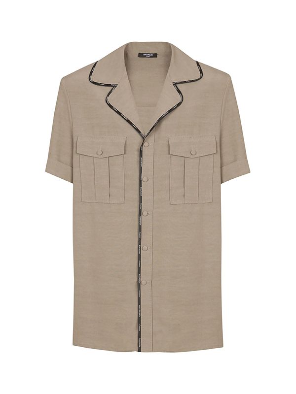 Front button fastening, notched collar, contrasting trim, logo-print edge, short sleeves, chest flap pockets, appliqué logo, straight hem.