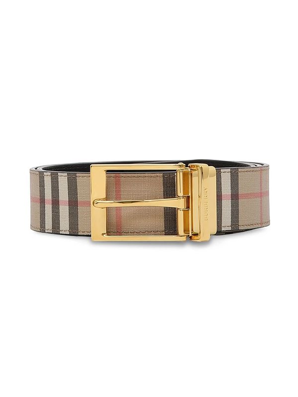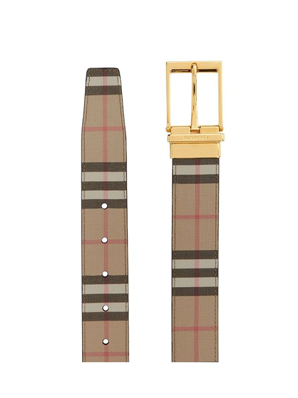 Vintage Check pattern, gold-tone buckle fastening, engraved logo, punched holes, adjustable fit.