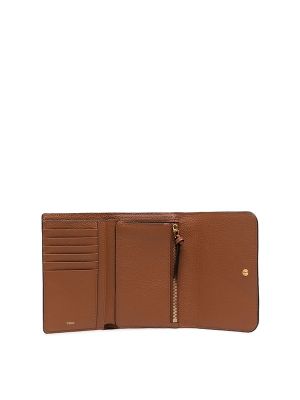 cognac brown calf leather pebbled texture tri-fold design gold-tone logo plaque concealed press-stud fastening internal logo stamp internal card slots internal zip-fastening pocket note compartment. Size: Depth 2 cm, Length 10 cm, Width 15 cm.