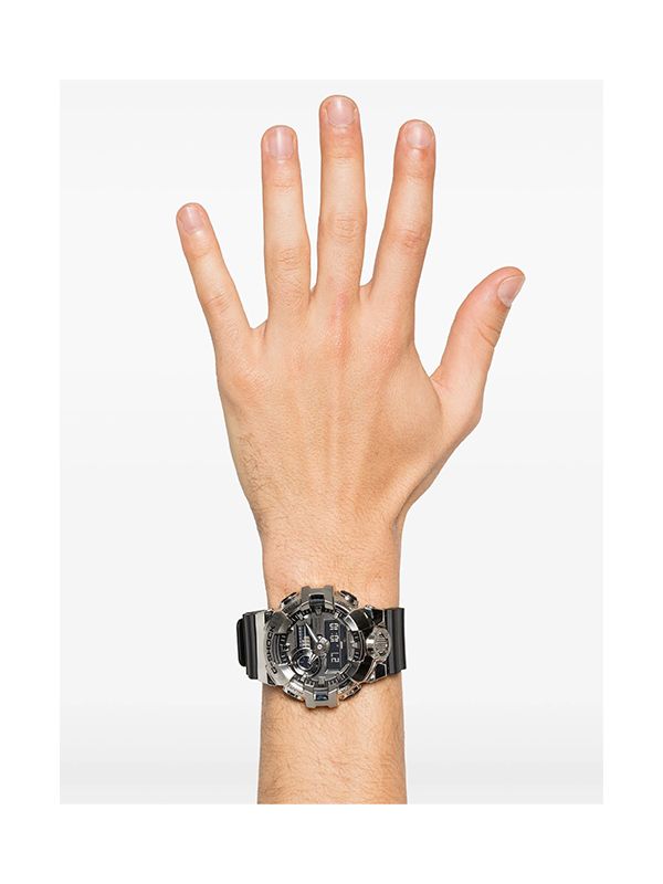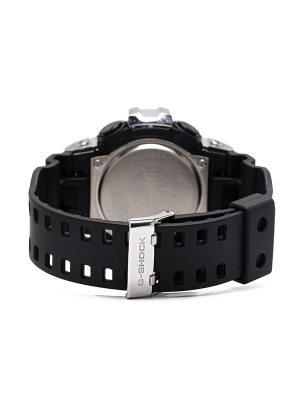 Quartz movement, silver-tone, baton dial, stick hands, mineral glass, logo-engraved bezel, resin bracelet, tang-buckle fastening, water resistance up to 200m/20 ATM, LED backlight, date indication, countdown timer, shock-resistant.