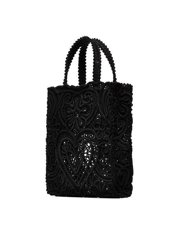 Crochet knit, heart motif, gold-tone logo plaque, two rounded top handles, main compartment, no lining.