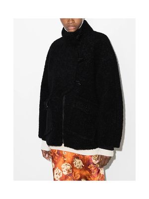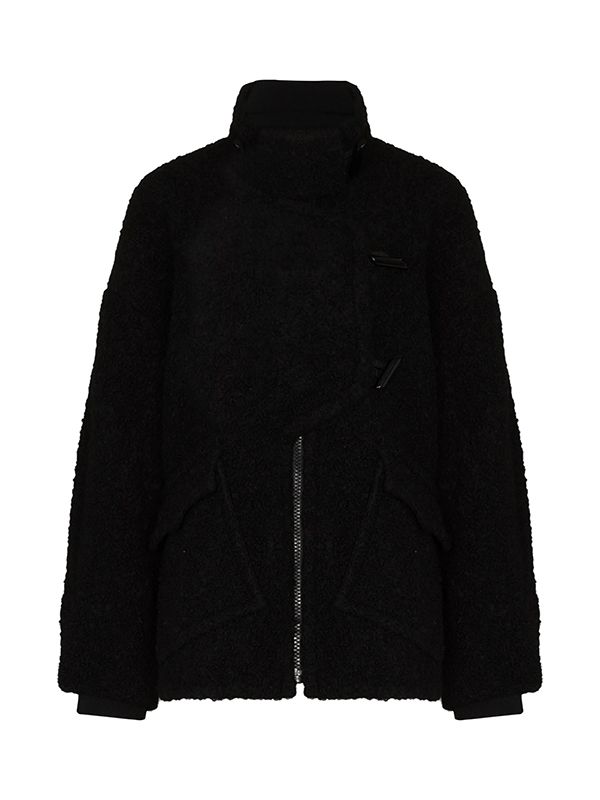 Black asymmetric boucle buttoned jacket from GANNI featuring asymmetric front button fastening, front toggle fastening, high neck, front zip fastening, long sleeves and straight hem.