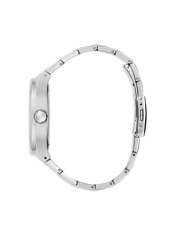 42mm, cushion face, guilloché dial, baton hands, quartz movement, screw-down crown, adjustable link bracelet, folding clasp.