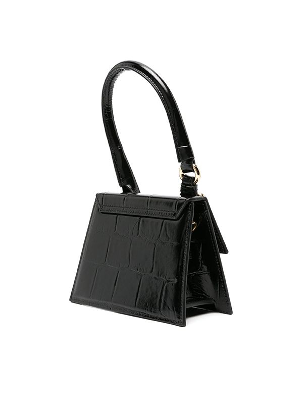 Fold over top with magnetic fastening, embossed crocodile effect, gold-tone logo lettering, decorative buckle detailing, single rolled top handle, adjustable detachable shoulder strap, cotton lining, internal logo patch.