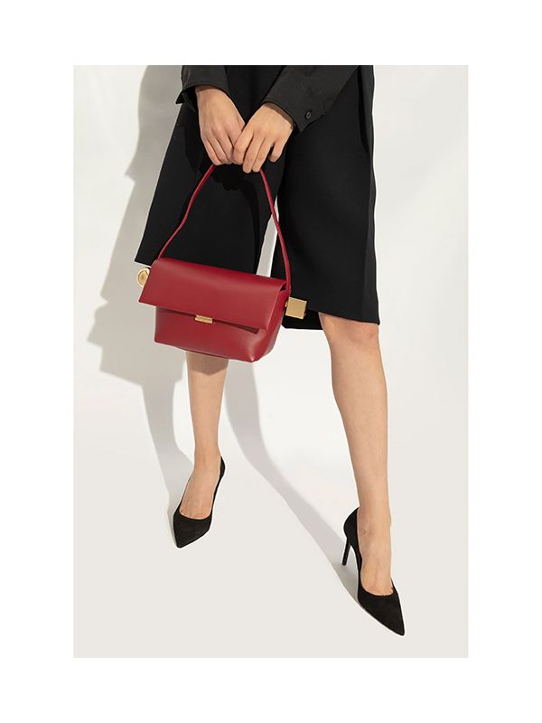 Fold over top with magnetic fastening, single shoulder strap, engraved logo, partitioned compartment.