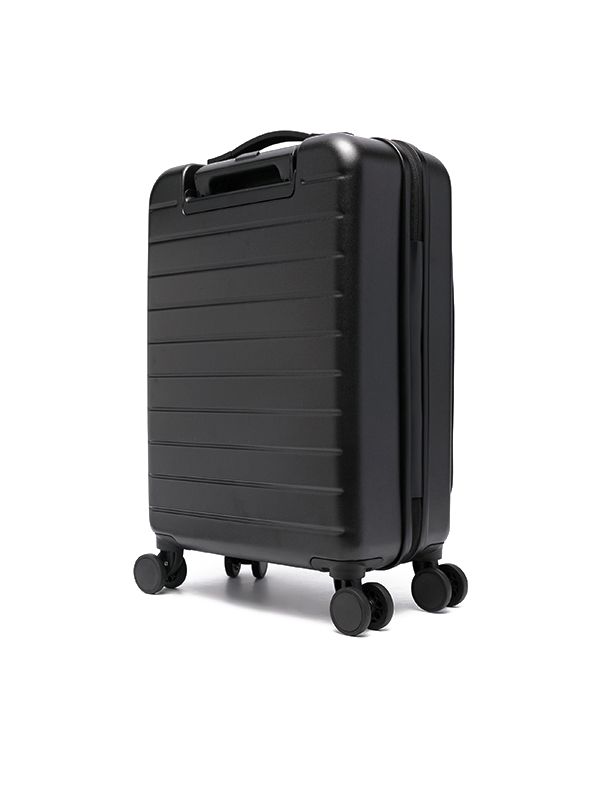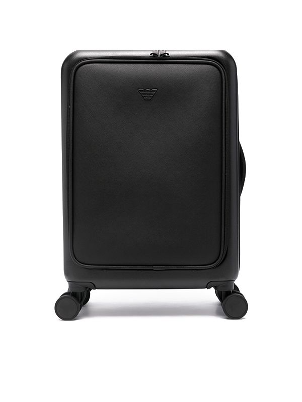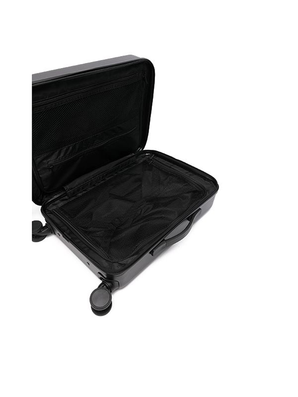Material: 100% Polyurethane,100% Polyester, 100% Acrylonitrile Butadiene Styrene (ABS) All-around zip fastening Single top handle, single flat side handle, single extendable handle, tonal logo plaque, front zip-fastening pocket, partitioned compartment, four wheels Height 47cm, handle 3cm, depth 20cm