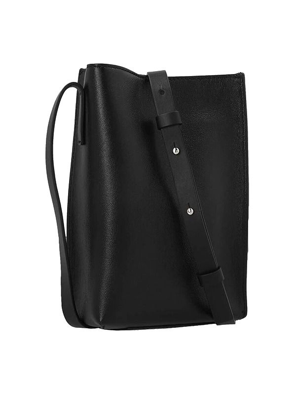 Leather bi-colour bag with adjustable shoulder strap, magnetic fastening, inner open pocket, cotton lining and embossed logo.