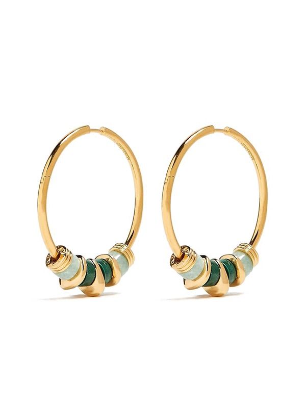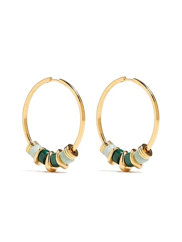 These oversized 18ct gold vermeil Abacus beaded large hoop earrings from Missoma showcase a blend of removable gold beads and rounded gemstones featuring malachite, known as the transformation stone, and healing amazonite.