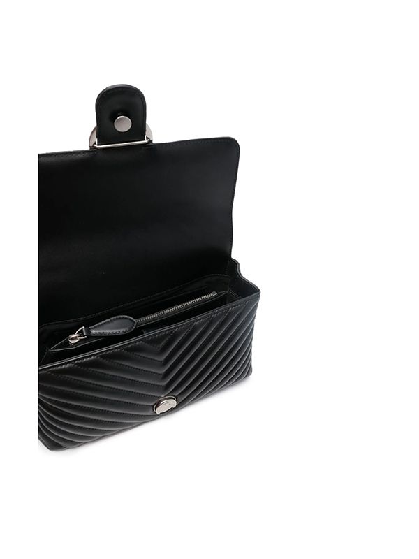 quilted logo plaque foldover top with press-stud fastening single circular top handle detachable shoulder strap internal zip-fastening pocket partitioned compartment full lining.