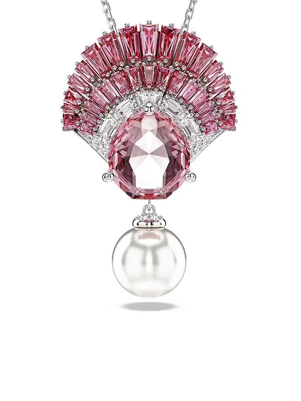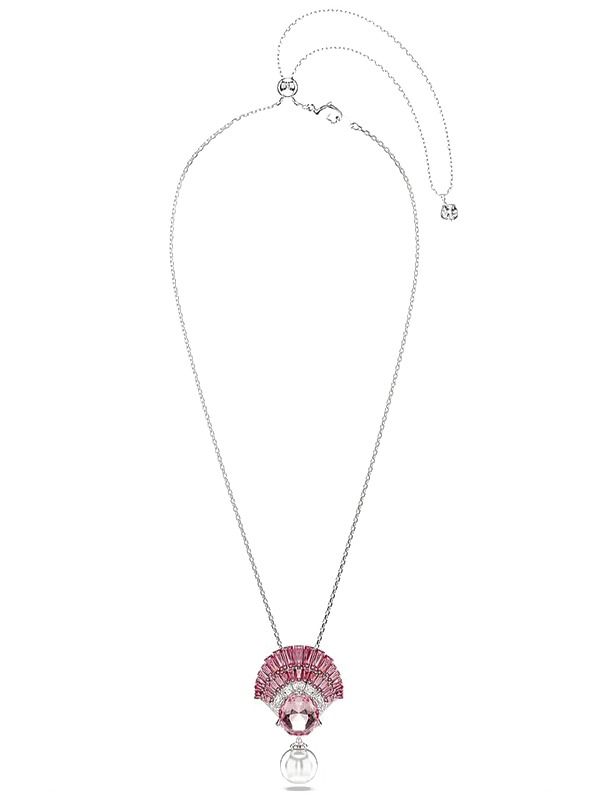 Idyllia Pendant Necklace with Mixed-Cut Crystals in Pink and Rhodium Plated. The tranquility of the ocean will shine through in your style with this marine-inspired pendant. Worn on an elegant chain, the rhodium-plated design features a central shell motif, embellished with a series of clear Swarovski Zirconia and a bright pink central crystal.