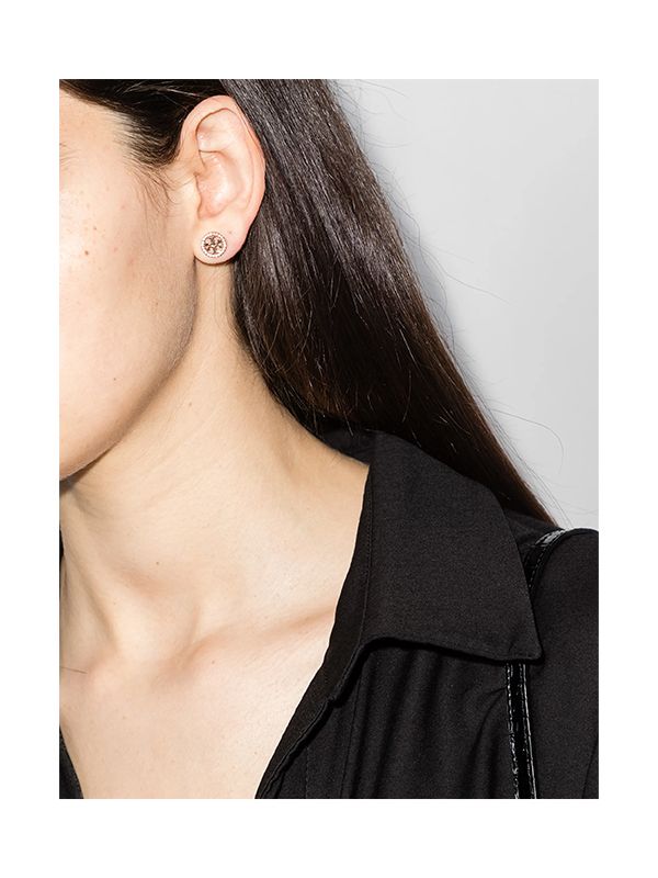 Boasting the brand's 'T' logo with a cut-out frame, these Tory Burch small stud earrings were made for pierced ears. The timeless iconic pair is trimmed by a pavé of crystals in this new iteration.